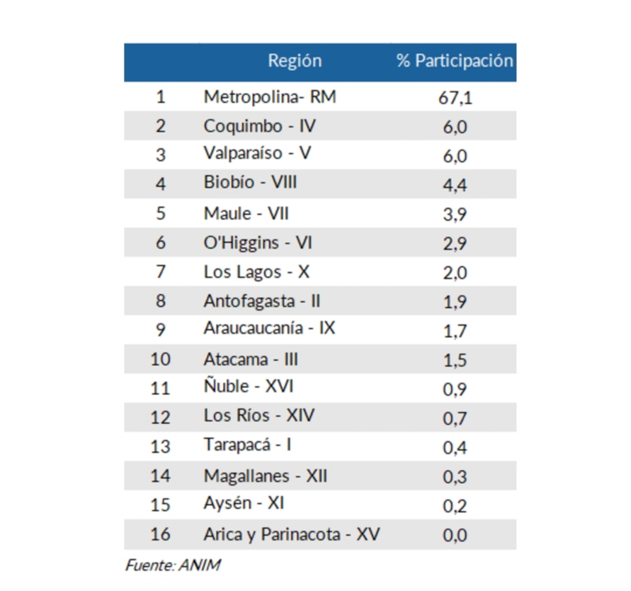 En el primer semestre de 2025, la Región Metropolitana concentró la mayor parte de las ventas de motocicletas en el país, alcanzando un 67,1% del total, según cifras de la Asociación Nacional de Importadores de Motocicletas (ANIM). Muy por debajo aparecen las regiones de Coquimbo y Valparaíso, ambas con un 6%, seguidas por Biobío con un 4,4% y Maule con un 3,9%.