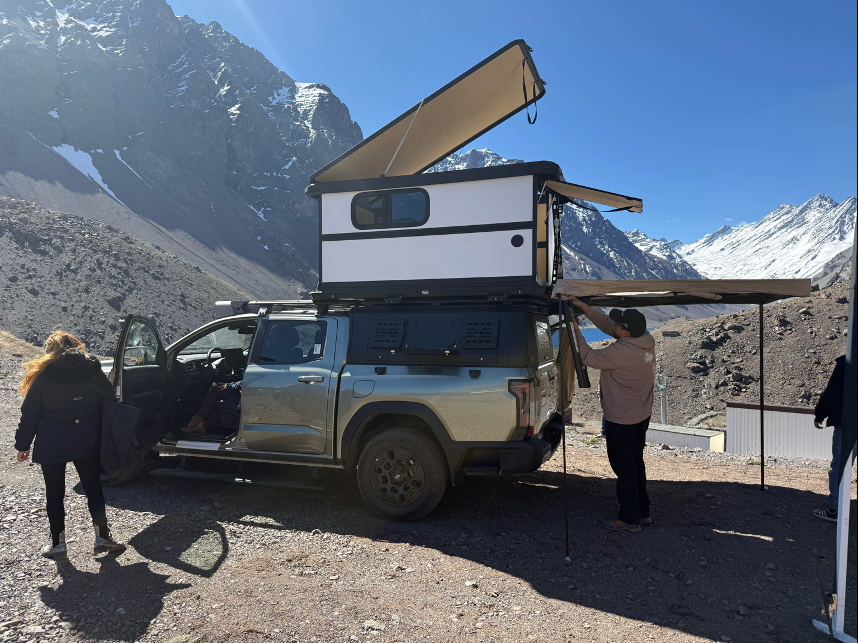En América Latina, la camioneta es también un puente que une la ciudad con la naturaleza. Las empinadas pendientes de Los Andes, los intensos vientos de los altiplanos y el polvo persistente de los caminos rurales plantean exigencias extremas en cuanto a capacidad de carga, protección y habitabilidad. La edición de camping HIMLA responde a estos desafíos con una cubierta expandible de alta capacidad, diseñada específicamente para entornos complejos. Fabricada en perfiles de aluminio de alta resistencia, combina robustez y ligereza, ofreciendo una excelente protección contra el polvo y el agua, al tiempo que amplía significativamente el espacio útil de la caja trasera. Su estructura superior cuenta con anclajes preinstalados para portaequipajes, permitiendo integrar módulos adicionales como tiendas eléctricas o toldos envolventes de 270°. Con una capacidad de carga estática de hasta 300 kg, el sistema garantiza la versatilidad necesaria para cubrir las demandas de equipamiento en campamentos familiares o expediciones de larga distancia.