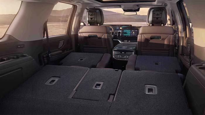 3. Soluciones de carga y almacenamiento innovadoras y versátiles: Pensando en la practicidad y el confort diario, Ford Expedition 2025 introduce el portalón con apertura dividida, ideal para utilizarse como mesa en actividades al aire libre y facilitando el acceso a la carga en espacios reducidos. Además, cuenta con la exclusiva consola Flex Powered, que se desplaza hasta 20 centímetros para optimizar el espacio y el almacenamiento. Su diseño permite que, al apagar el vehículo, quede completamente bloqueada y oculta a la vista, ofreciendo un espacio seguro y discreto para resguardar objetos personales. Una de las novedades es la tercera fila con un asiento central abatible, que permite acomodar objetos largos como cañas de pescar o esquís sin sacrificar espacio para los demás pasajeros. Esta configuración, sumada al piso plano 40/20/40, garantiza un amplio y versátil espacio de carga.
