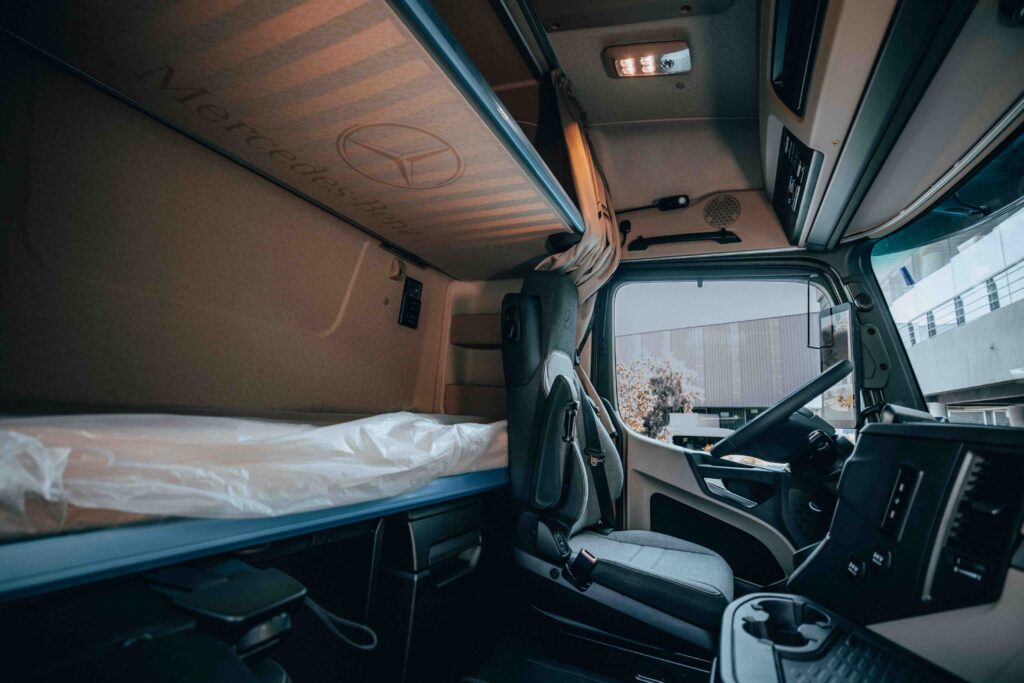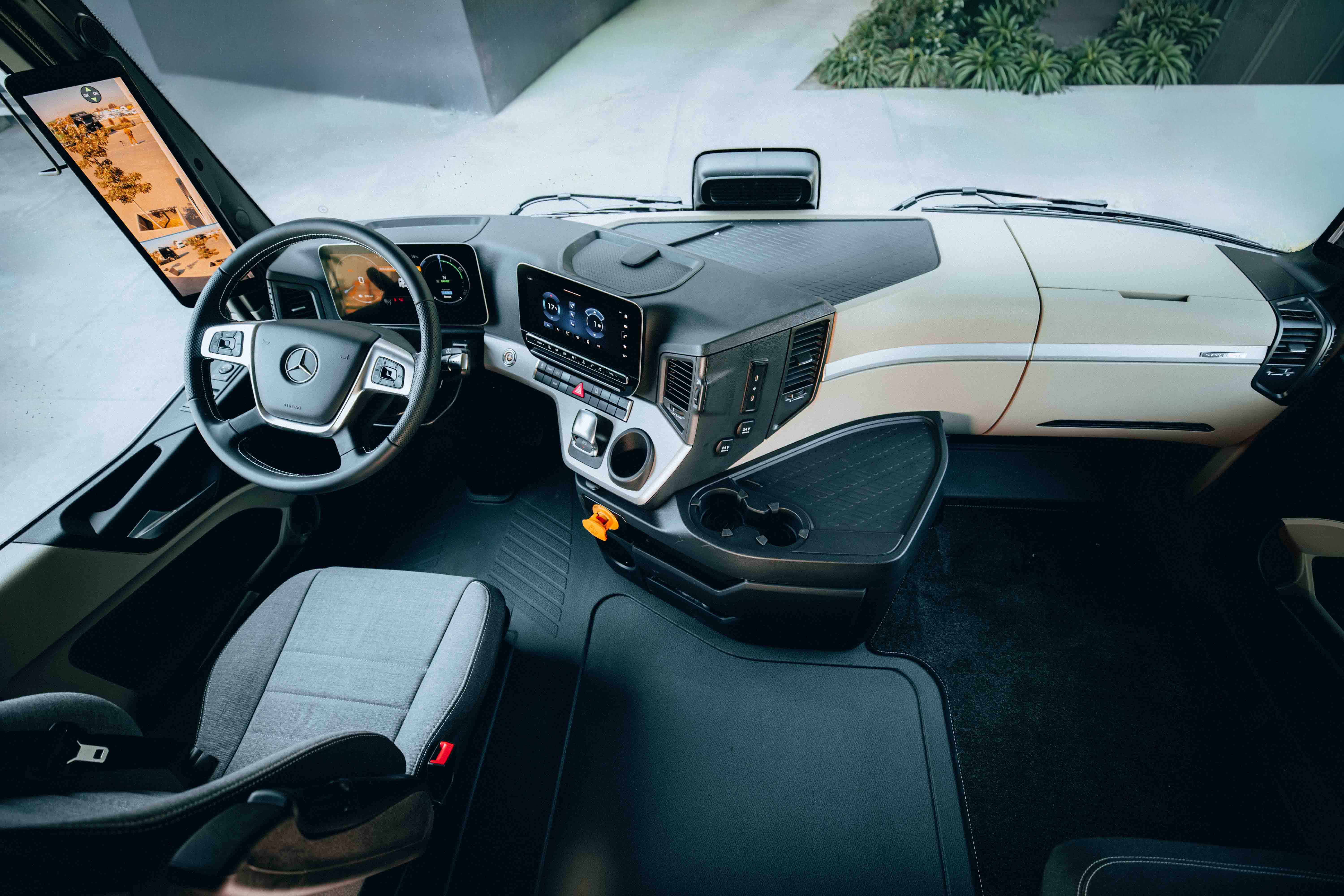 En la cabina, el conductor opera en un entorno premium pensado para jornadas extensas, con materiales de alta calidad, iluminación ambiental y una experiencia digital centralizada en el nuevo Multimedia Cockpit Interactive-2, que incluye comandos por voz “Hey Mercedes”, pantallas digitales de nueva interfaz, conectividad inalámbrica con Apple CarPlay y Android Auto, y una botonera reorganizada que simplifica la operación diaria.
